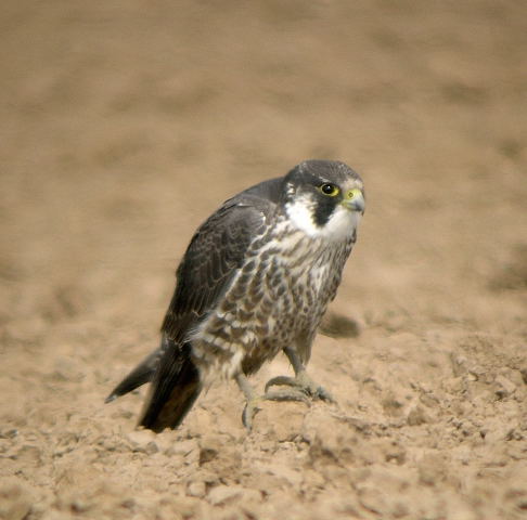 Sat in field near Grainthorpe Haven early morning, still in same spot when i went home 4 hrs later, did'nt look 100% happy, kept raising it's left foot which may be damaged, also i am confused by leg colour, according to Forsman ect all Peregrines feet are yellow on fledging, comments please.